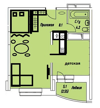 Половину кухни объединить с лоджией и сделать там комнатку для детей ( на будущее.. там будет 2х этажная кровать... игровая зона на балконе. ). Балкон утеплен. Вход сделать из комнаты.
