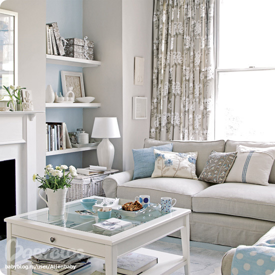 Всё о полах , стенах, потолках и материалах для нихДевочки, всем привет! Посоветуйте, пожалуйста, как можно обыграть комнату с голубыми обоями. Уж не знаю как муж меня уговорил на них, хотя я изначально была против, т.к не люблю этот цвет. Так вот теперь никак не привыкну к этой голубой комнате:( Люстра на тон темнее обоев, шторы такие же по цвету. Тюль белая(обои голубо-белые), пол-линолеум темный, мебель цвета орех(уже была у нас). Получается какое-то несочетание цветов. Подскажите, что изменить, может покрывало синие или картину на стену? У кого еще голубые стены, может покажите свой интерьер с фото? Буду очень благодарна!