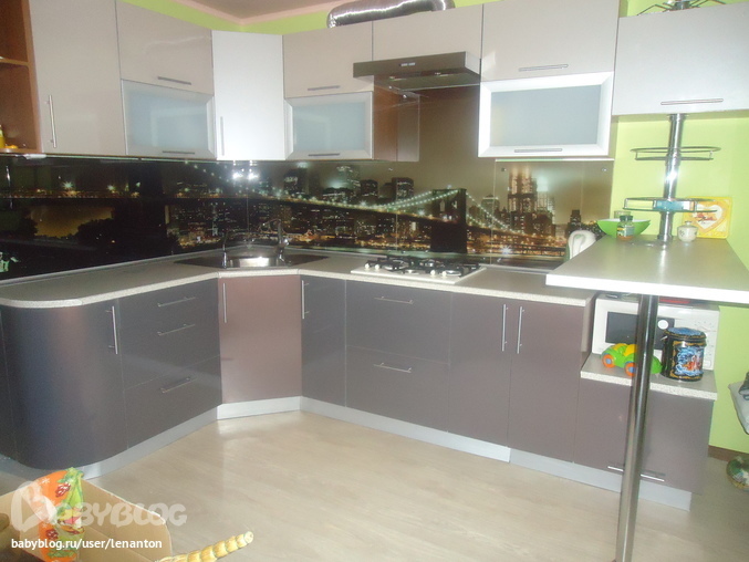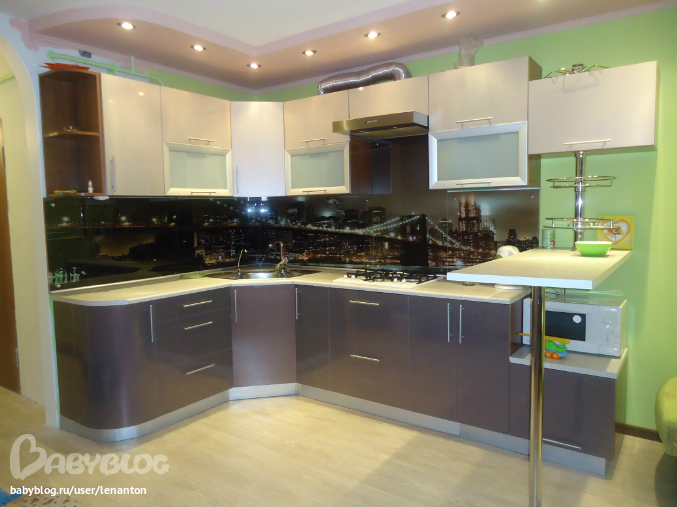Зеленый цвет вообще, на мой взгяд, лишний..пастельные тона или сиреневый неяркий смотрелся бы лучше. А кухня классная и цвет и дизайн.