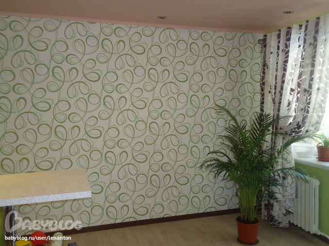 зеленый только на одну стену можно было бы . и то лучше без рисунка однотон, возможно холодных оттенков . ну и шторы тоже надо бы без рисунка..фартук на кухне темноват ,лучше бы взяли зеленые листики какие нибудь с фото печатью , а вот стену тогда без зеленого-возможно теплый серый!