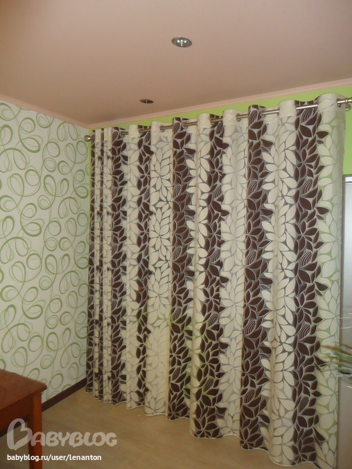 Шторы смените, а то и правла пестрят,однотонное спокойное просится,и последнее фото, кусок стены розовой,он у вас как переходит в зеленый цвет кухни не поняла??