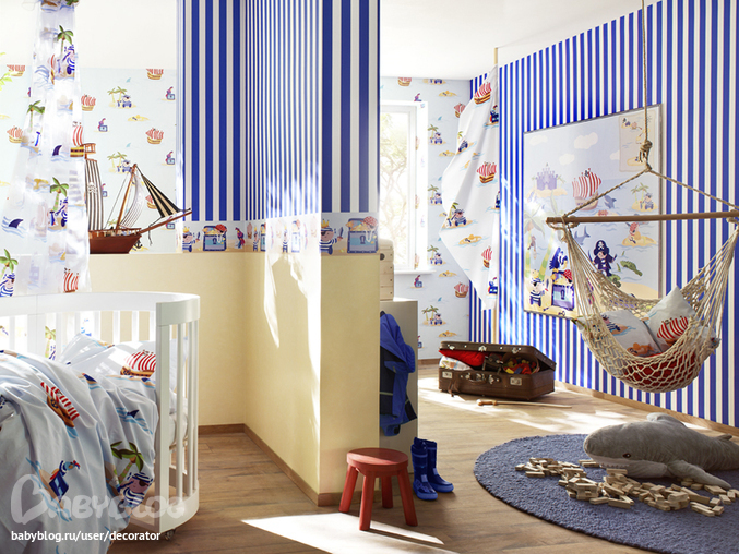может и не плохо будет рулонная штора ,но прамо на окне,а микровуаль пусть до пола будет нежно голубой или молочный,или шампань,и если вам понравился пиратский стиль,то поверх вместо плотной шторы тюль сетка крупная,в контраст микровуали)))Жаль ,что мы пока не располагаем такими площадями и мои пацаны ютятся в малюсенькой комнатке,ох я бы там поразмыслила))))))))))))))))