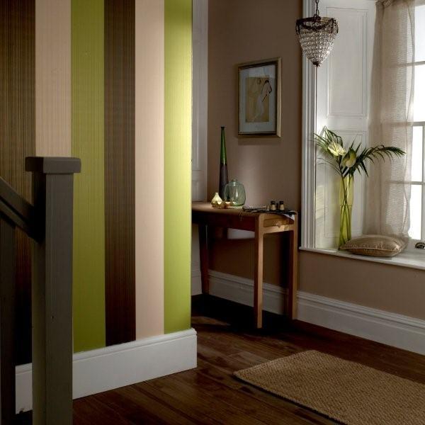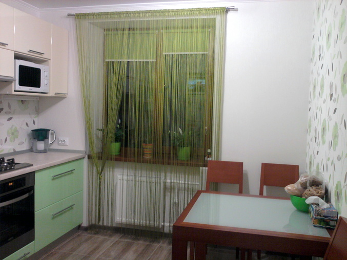 Планирую поменять и шторки,в зелёный цвет.Вообще я хочу на стену где гарнитур и окно наклеить обои в полоску,а где стол там пано из других обоев сделать.Вот такие обои хочу.