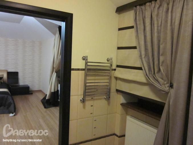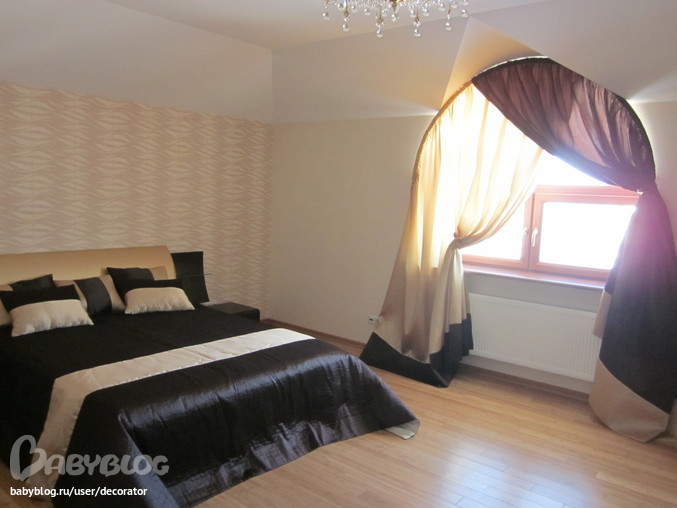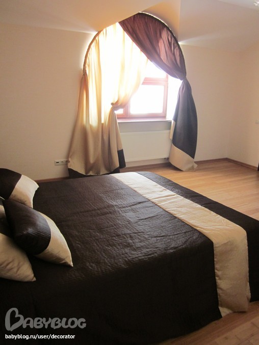 Окно в санузле (это же санузел?) очень красиво оформлено. Очень понравилось! А в спальне оформление окна выглядит тяжеловато, на мой взгляд. Но в целом, очень симпатично получилось.