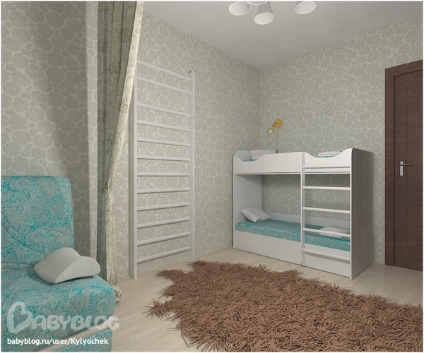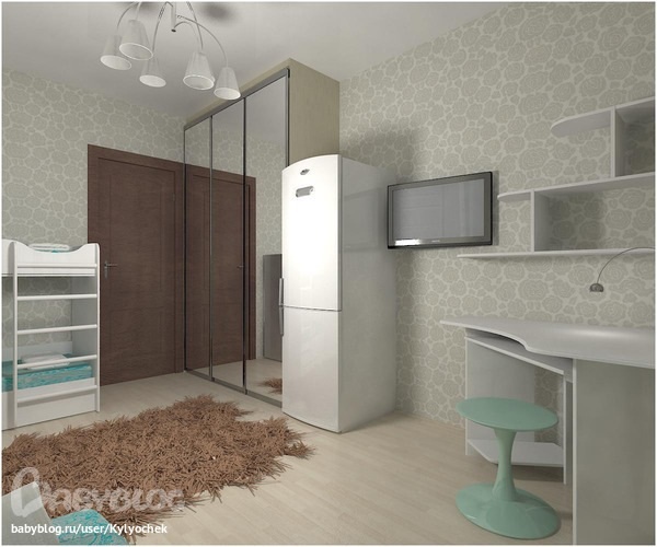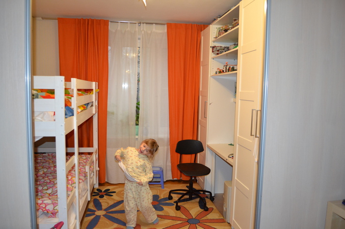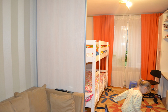 У нас была комната 18м2, делали перегородку посередине с радвижными дверьми. У окна была детская, а где вход в комнату стоял наш диван, шкаф-купе и стелаж с тв. В принцыпе было удобно, и вечером от детей можно закрыться)))