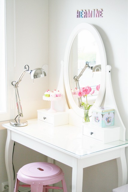 это комната девочки? отличная идея - белая мебель, темные стены. Только вот кресло и письменный стол как-то не очень. Стол увеличить, кресло перекрасить))))) Мое мнение - здесь не хватает третьего цвета - самого яркого или цветного мотива/узора. Кресло должно быть таким)