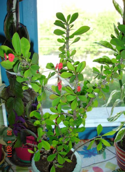 Молочай блестящий "Терновый венец": Euphorbia millii. Семейство - молочайные. … Цветки мелкие, розовые или красные. Растение цветет почти круглый год. Ядовит.