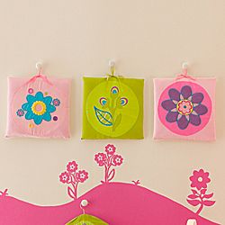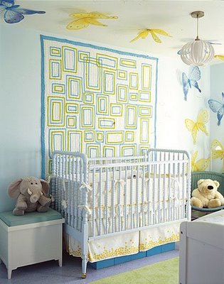 Я не думаю, что нуно что-то клеить на стену. Может флажки подходящих цветов повесить? Их и стирать можно, когда запылятся))) Или нежный легкий полог 0 тоже можно часто стирать, он быстро сохнет и придает уют. Или как на нижней картинке - пэчворк картину)))))))
