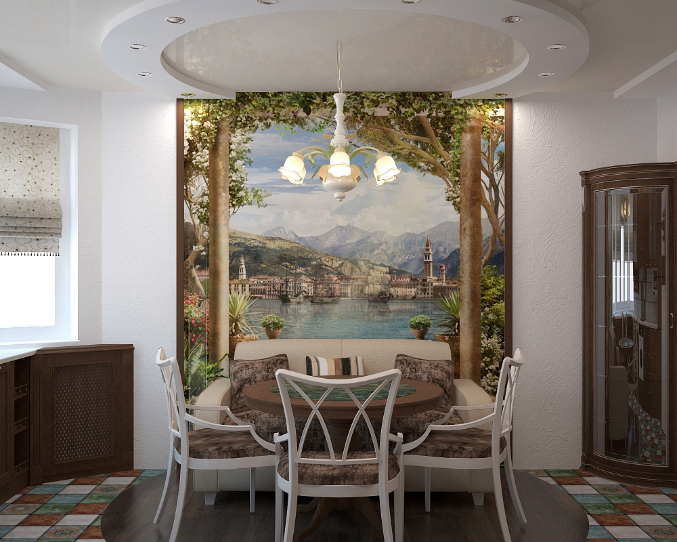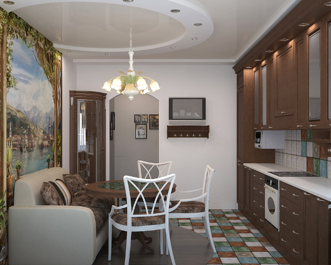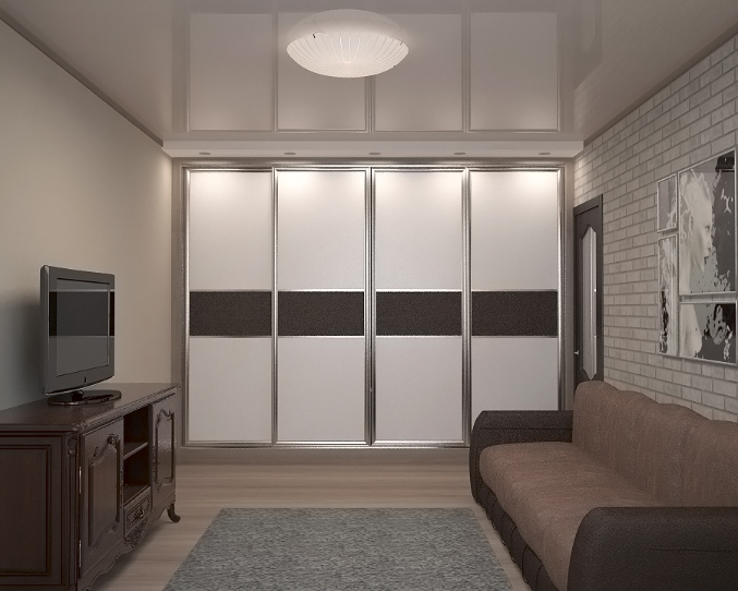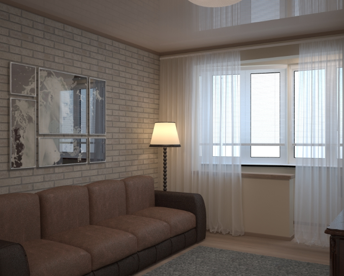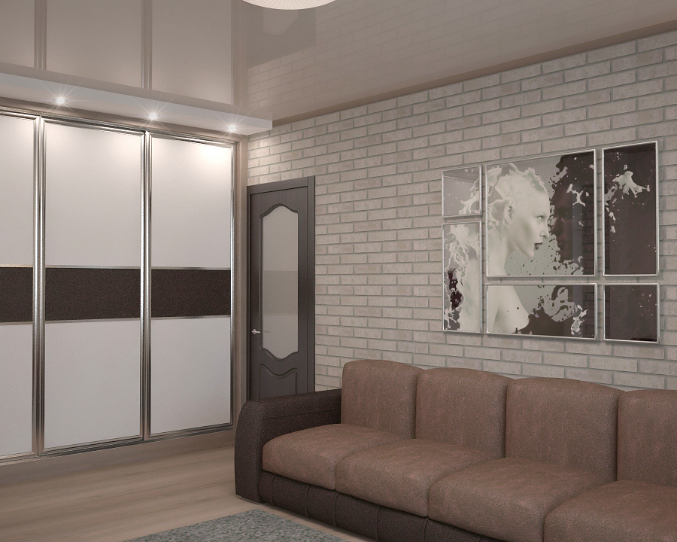 На стене декор кирпич. Гипсокартоновый потолок в процесее работы решили сделать радиусным,а не прямым(идея заказчицы,мне очень понравилось).