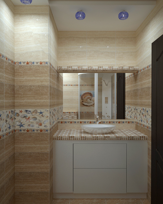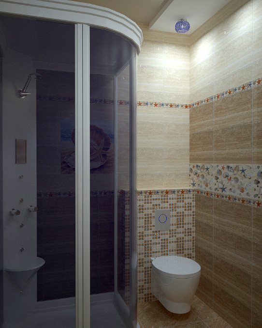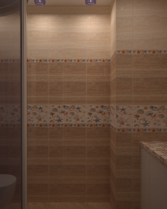 Декор "Ракушка на море" сдвинется по факту и будет над инсталляцией унитаза , т.к. заказали душ кабину с закрытыми а не стеклянными стенками: