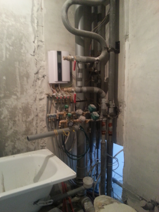 Ванная. Вид на стояк. Установлен проточный водогрей.