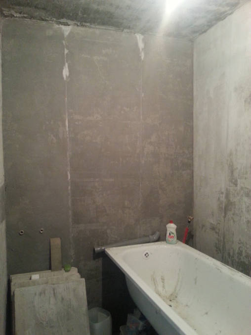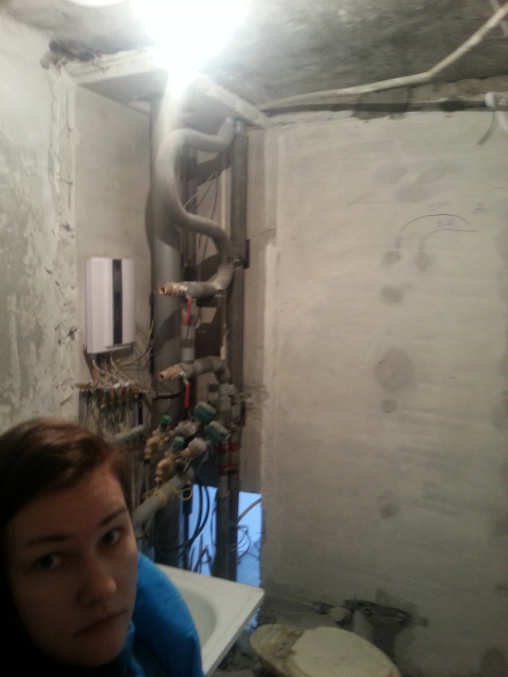 Ванная вид на стояк и стену ,где будет раковина. Ну и моя моська,не удобно фоткать было,хотелось чтобы всё вошло...