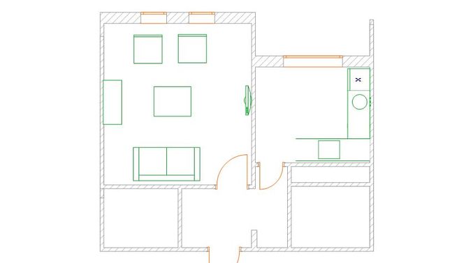 Оксана, недавно делала проект похожей квартиры, только она еще меньше вашей(вариант расстановки для примера).Сначала вам нужно определиться с расстановкой мебели и только потом решать, как обыграть радиатор отопления. Но идея с камином наиболее удачная,только нужно сделать вертикальный короб, имитирующий дымо