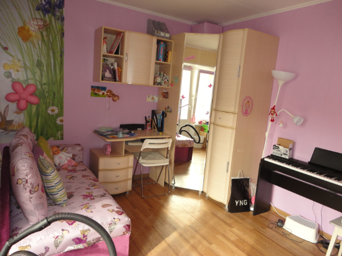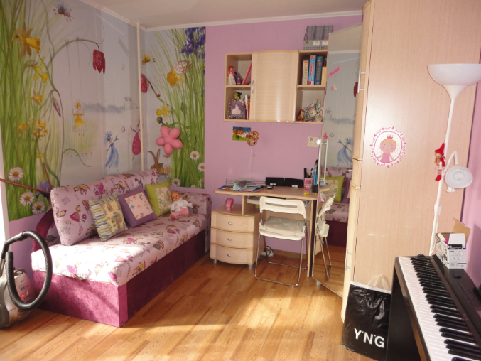 вот сделали так, мысленно, хоть и неровно, разделили комнату на две части. одна сиреневая, вотчина старшей