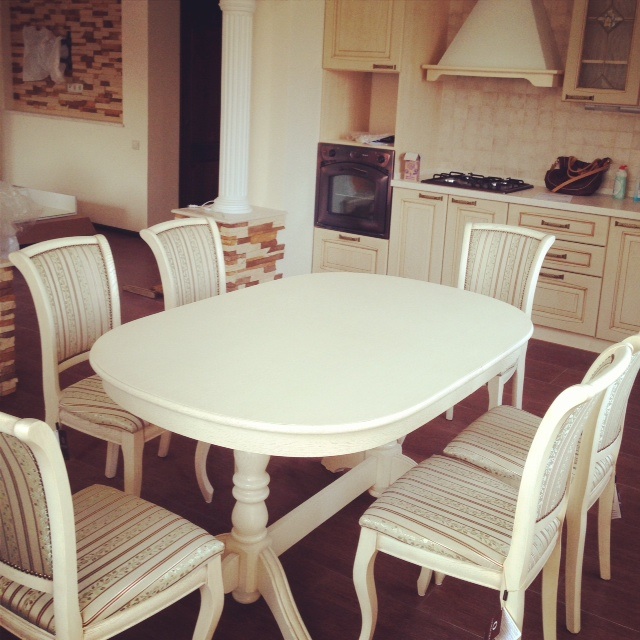 Будет кухня просторная, полы - плитка керамогранит, цвет - кофейный, а по периметру выложена плитка кремового цвета. Цвет стен - желтоватый, даже бледно-желтый. Какого цвета сама кухня? Хочу из массива... Хотела какой-нибудь беленый дуб, но мне кажется, потеряется он здесь...