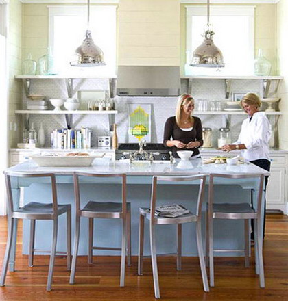 Если обеденной группы этой нет,то тогда взяла бы мебель светлую, примерно такого цвета как столешница с глянцевой поверхностью - это стол, на стулья сделал бы подушечки полосатые. На окна деревянные жалюзи + легкие шторы красиво задрапированные и завязанные узлом. Подсветку над рабочей зоной и абажур или светильник (см. картику внизу) над столом.
