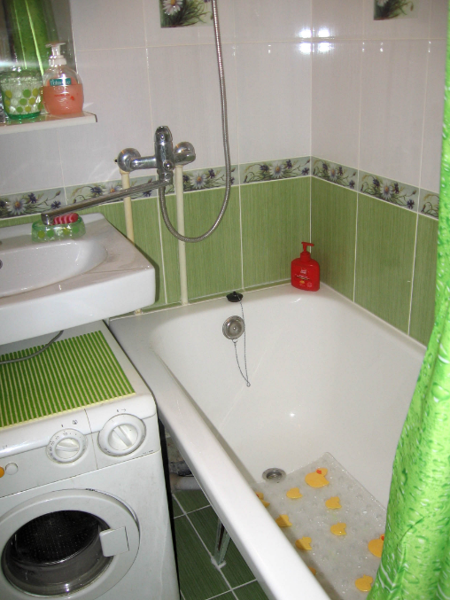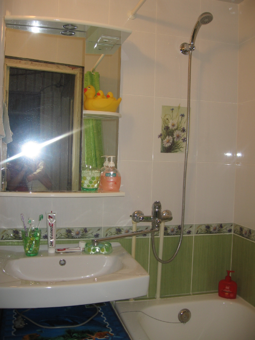 Очень нравятся ромашки на плитке. А почему трубы в стену не спрятали? Мы тоже не прятали,т.к. у нас конструктивные особенности дома-не позволяют,но у нас их так не видно(гдето 3-4 см над ванной.)