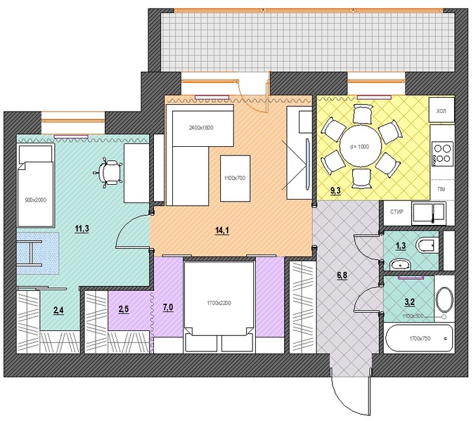 У вас отличная площадь! Решений здесь может быть достаточно много, предлагаю рассмотреть такой вариант.