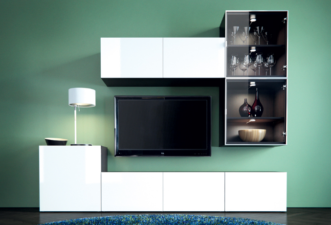 Имеем: гостиная ок.20м, стены кремовая полоска(обои), двери и пол(будет) под беленый дуб, диван дымчато-серый. Выбираем тумбу под ТВ+полки навесные.