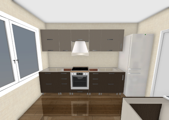 напротив холодильника мойка и пмм, они будут только там, чтобы стояк не тянуть, кухню потому что в маленькую комнатку перенесли. А над мойкой шкафчики для химии с тряпочками и сушка.