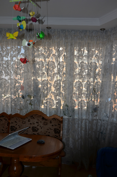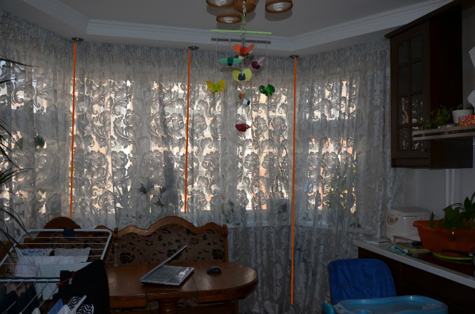 Настя, мне очень-очень нравится идея с римскими шторами: вам и к дивану по стилю подойдет (светлую обивку сделать например). А этот тюль можешь использовать в спальне, когда захочется чего-то новенького. Ну или шторы сюда надо добавлять, чтоб "забить" цветы, но все равно, вид будет не кухонный, лучше римские...