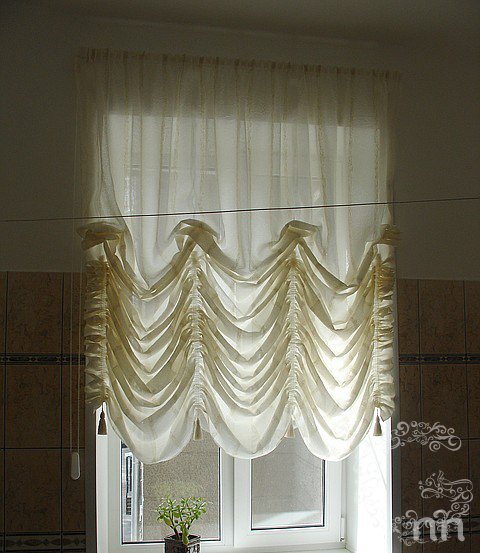 Не нашла..Наверно уже удалила..Но смысл в том, что снизу идёт обычная вуалька, а сверху 3-4 хвоста из вашей тюли с деревянными кольцами. Типа как тут, только кольцо ниже сделать.