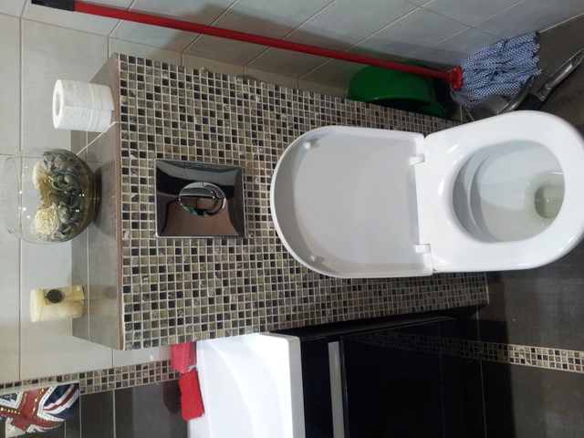 Звездец! Ну сыну унитаз есть, теперь себе придется второй делать. Че за жопорукие делают, ведь соглашаются, работают, значит знают как делать - так нет, мля, все через одно место! А не у вас клеили плитку в виде картины?