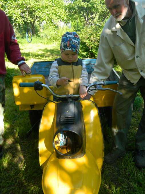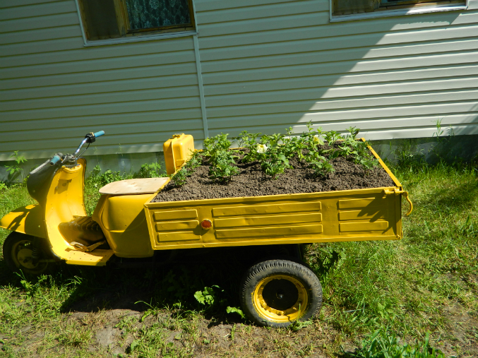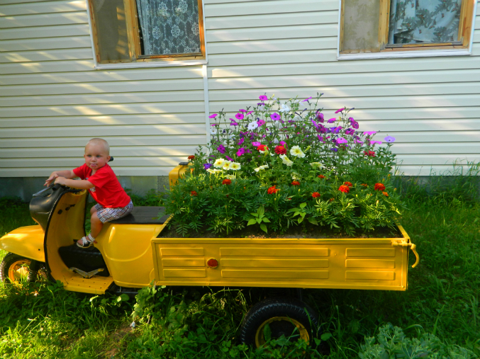 Был у мужа мотороллер-муравей лохматого года выпуска (примерно мой ровесник, те конец 80х). Куплен был непойми зачем в уже неисправном состоянии и стоял догнивал на задах огромного участка свекров. Несколько лет муж грозился его починить, но никак. И тут пришла идея а что если из него сделать какое-то подобие клумбы...
