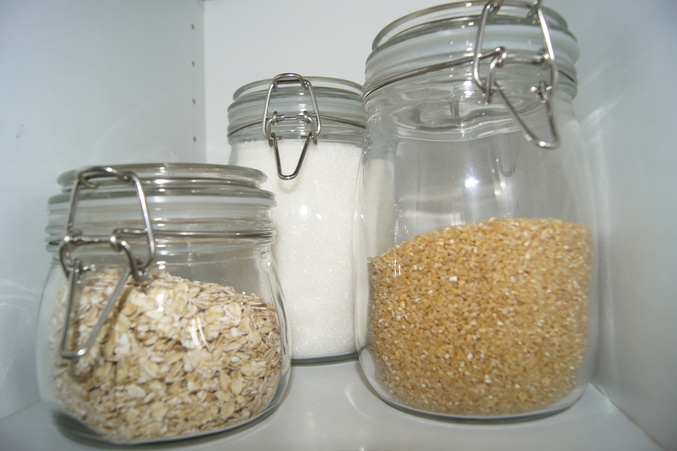 Баночки для круп. Теперь все раложено аккуратно, а не в пакетиках, из которых постоянно все сыпется.