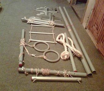 из детский воспоминаний: дома стоял комплекс (российского пр-ва, названия не знаю увы!) на нем были канат (использовался нечасто), лестница веревочная с мет. ступеньками, кольца - моя любовь, и трапеция (палка на веревках) - это и качели, и для подтягиваний/кувырков. Супер вещь! По конструкции это была мет. распорка от пола до потолка (не крепилась к стене), вверху была крестовина, на которой все эти чудеса держались. Стоял крепко - я со своими 50 кг качалась не боясь уже когда подросла даже. Оч. советую!