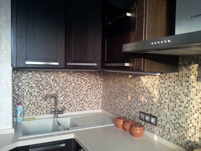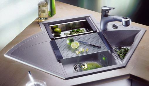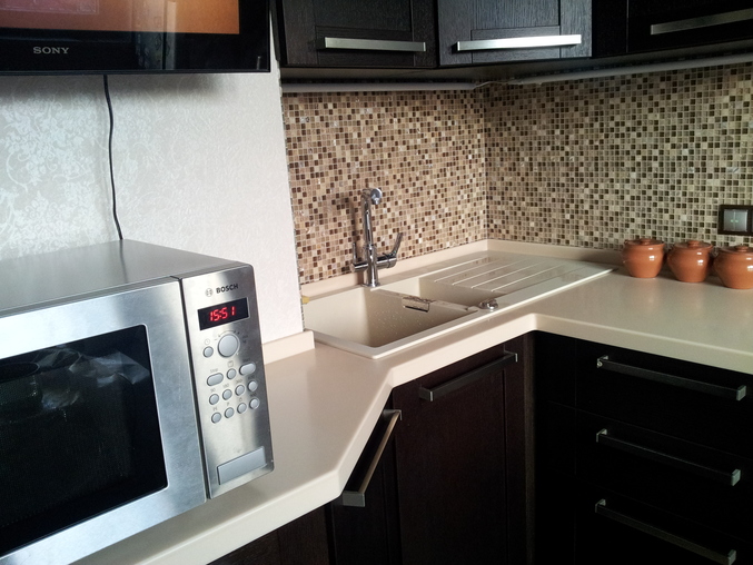У меня мойка расположена в углу, поэтому особо она ничего не отняла, рабочей поверхности вполне хватает, а в этой мойке удобно мыть и сушить протвини и большие кастрюли, я много готовлю.