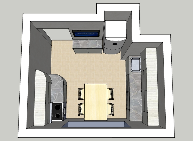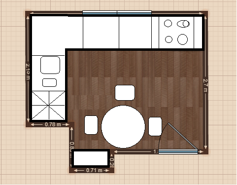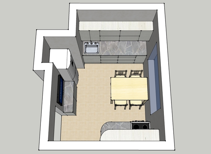 Печально, что так низко окно. А то можно было бы кухню сделать Г образной под окном. Как уже и предлагали некоторые. Все же мойка от газа очень далеко. Таскать посуду туда сюда не удобно. Можно придумать все же что-то с окном.