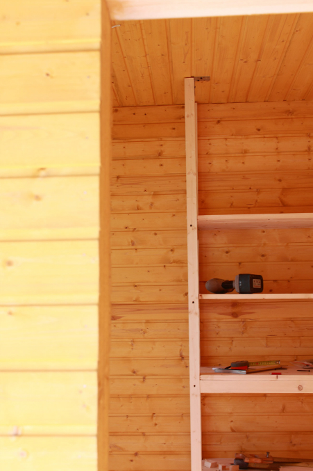 Есть у нас вот такая маленькая комната, пристроенная к крыльцу (назовем ее верандой). Площадь где-то 7 кв. м. Стены и потолок околочены вагонкой, обработанной защитным сердством для дерева цвета сосна. Так вот мне очень не нравится, что потолок не отличается от стен, находясь в ней ощущаешь себя в коробке. У меня родилась идея, стыки между досочками покрасить белой краской, получится полосатый потолок. И белый еще будет на дверцах шкафа (фото ниже, строящийся шкаф).
