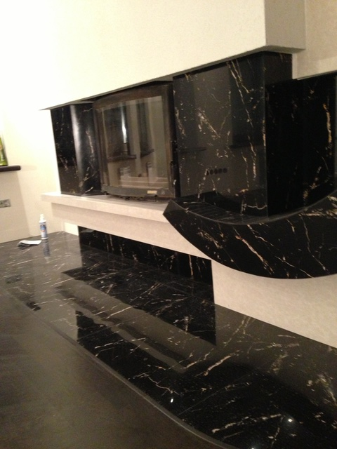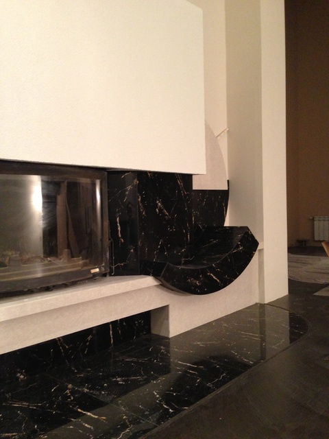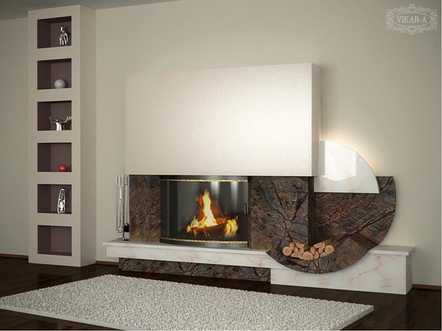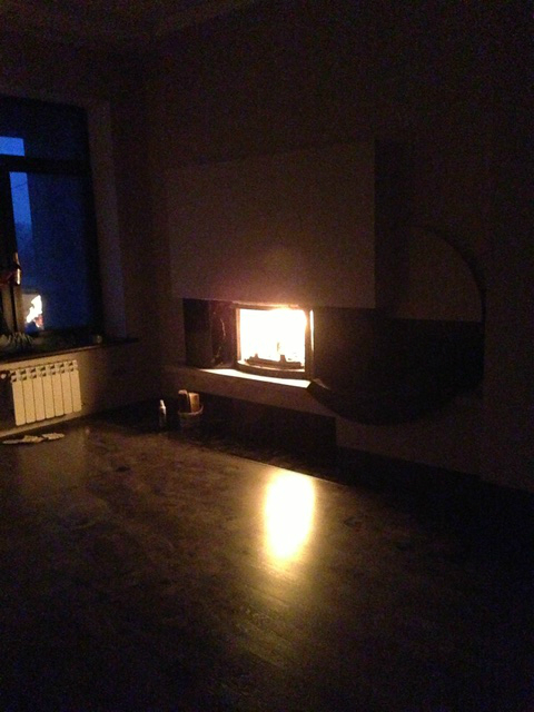 Мы купили топку с дверцей, которую можно не только открывать, но и поднимать наверх (то есть она двигается в вертикальной плоскости). Сама двеца не плоская, а выгнутая. С соблюдением всех технических норм, наши ребята установили камин, дымоходы, вентиляцию, вентиляционные решетки. Сверху все зашили гипсокартоном. Внешняя отделка керамогранит под мрамор двух цветов. Самое непростое было выложить полукруглую полочку для дров - по-моему, вышло не плохо, а главное, в несколько раз дешевле, чем мы бы заплатили, обратившись в любую компанию по установке и отделке каминов.
