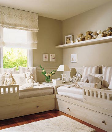 Цветовая гамма - восторг! Вроде и банальный девчачий розовый, но с оливой он такой изысканный! Насчет туалетного столика не уверена. Может не нужен он. Место занимает, но он им не нужен по сути. Может какой кукольно-игрушечный, который не жалко на балкон выкинуть при случае. А вот письменное место я бы сразу присмотрела для обеих девочек. Это кажется, что младшей еще долго, а на деле окажется, что не успели вы закончить ремонт, а уже надо что-то переделывать)))) ну и кровати рядком как-то не очень. Сама бьюсь над проектом для младших, муж за двухрусную, а мне страшно. Мосг сломала))) У меня в сохраненных есть прикольная картинка, но у нас так не становится. Может вам приглянется))))