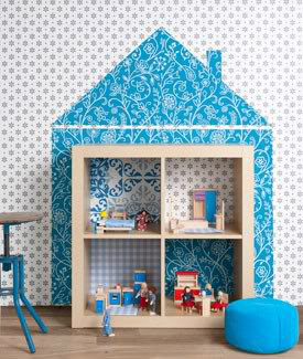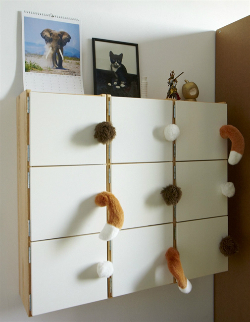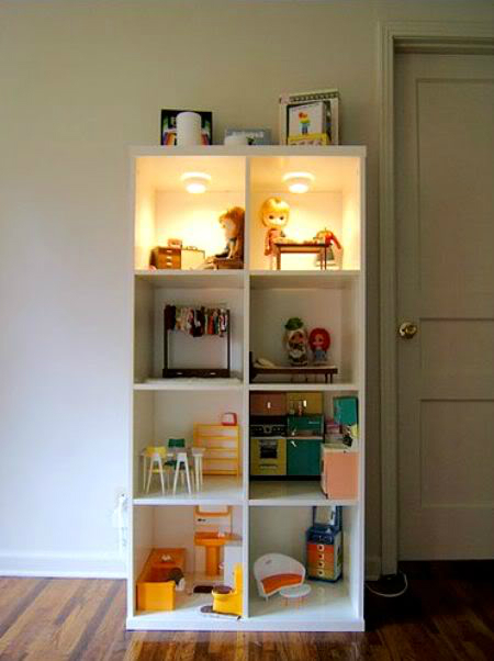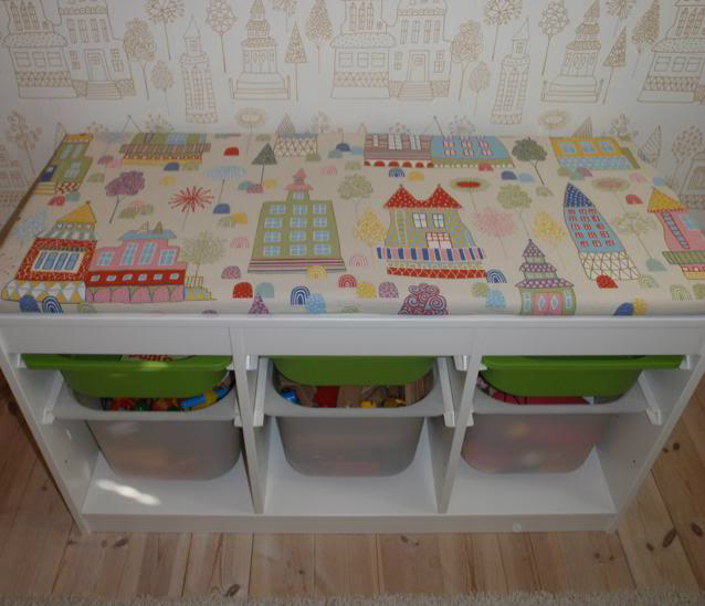 9. Стеллаж оклеен внутнри разноцветной упаковочной бумагой для подарков.