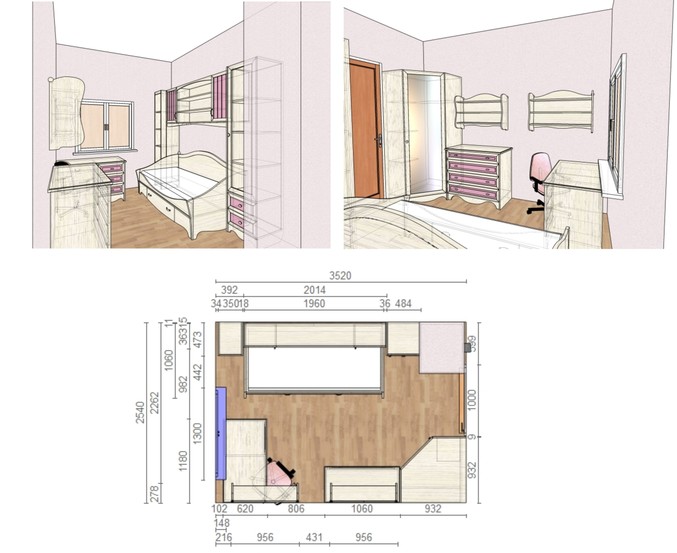малююююсенькие замечания: если соблюдать правила валеологии, то рабочий стол стоит не удобно - дневной свет должен падать слева (если ребенок правша); визуально левая часть перегружена (массивная система шкафов) по сравнению с правой (столики с эффектом воздушности, пенал со стеклом),глазу хотелось бы большего равновесия