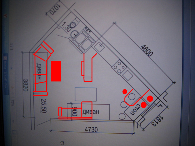 Вопросы и ответыДевочки, выручайте! Очень нужна Ваша помощь. Имеется кухня-гостинная 25кв.м. пятиугольная. Уже сломали голову как лучше там расставить мебель.