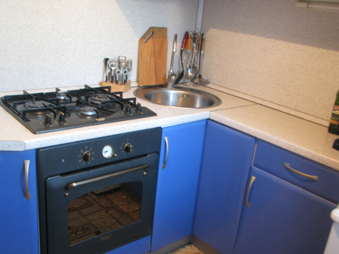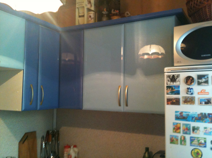 Интерьерное решение маленькой кухниДоброго времени суток. Имеется вот такая кухня 6 м2. Через неделю ремонт. Фасад комби, васильковый и голубой. Жалюзи на окнах белые. Какой цвет обоев сделать?