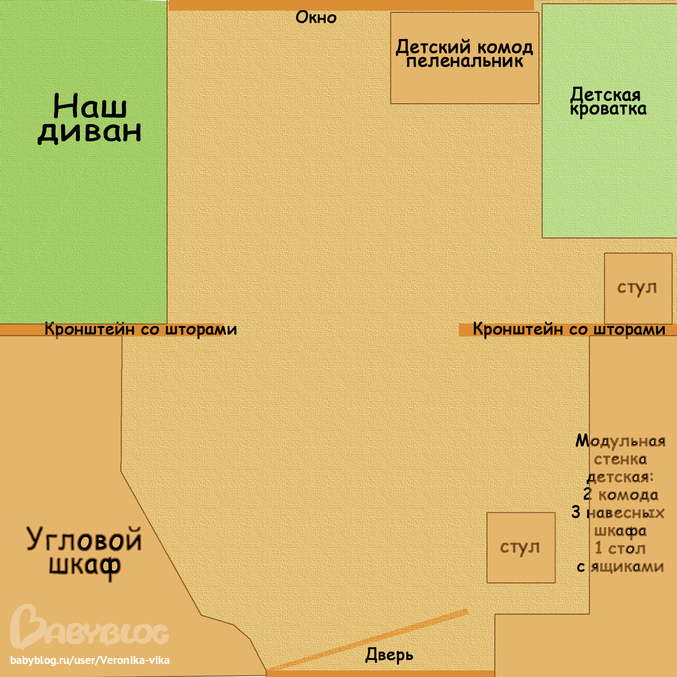 Комната у нас условно разделена на две зоны: спальная и рабочая зоны. На рисунке у меня это показано в виде кронштейна со шторами (а на шторах будут карманы для разной мелочевки и возле нашей кровати и возле детской. Но пока эти кронштейны еще только в проекте ))) Но мебель вся стоит. У нас еще много шкафов, т.к. мы живем не одни и пространство в виде шкафов в коридоре нам недоступно, поэтому все, абсолютно все вещи, включая коньки, палатку и спальники, мы храним в нашей комнате. Поэтому шкафов много и еще в них пустует место на вырост мелкому или им обоим )). Но так, как они высокие и узкие, и максимально по цвету к полу и обоям, то смотрится не громоздко.
