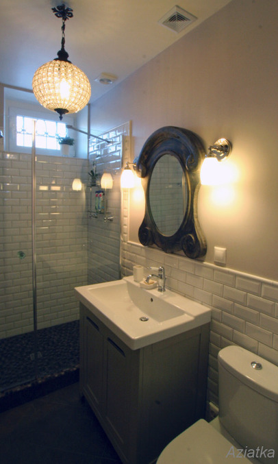 вот еще пример под 45 градусов плитки (можно вместо нее белую с серой затиркой, а на пол шахматку серо-черныю):