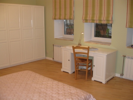 потом можно будет тоже подушечки и шторы повесить любого цвета и даже менять! по бокам кровати 2 тумбочки с настольными лампами пузатыми.