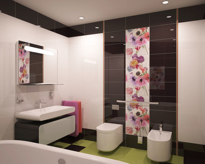 Если с цветами не переборщите, то обиженно смотреться будет:-|. Как в уходесложно сказать:-|, у меня плитка молодая почти белая и кофейная , за годпроблемс уходом небыло, сан узел как новый смотрится:-|.