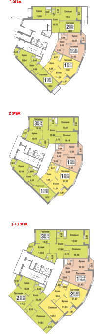 Первый вариант : 13 этаж квартира 70,05 (желтая) стены между комнат сносить нельзя т.к монолитные, я думю может быть из комнаты сделать две или из гостиной отгородить одну темную комнатку для нас, а детям большую отдать...вообщем не знаю..........я... помогите!!!!!!!!