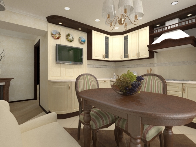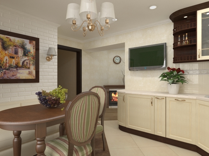 а мне очень нравится второй вариант с панелями под телевизором, кафелем до них и лампами над ТВ, но полочки круглые на верхних шкафах смотрятся интереснее на первом фото..