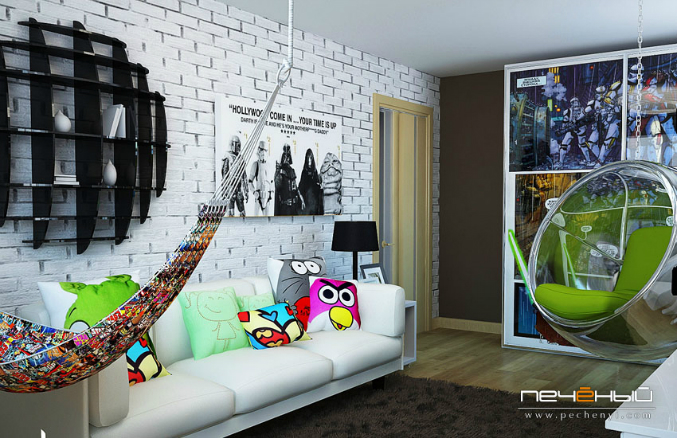 В частности, мальчик, для которого мы оформляли комнату, с ходу определился с концепцией: ему нравились черно-белые интерьеры (что весьма неожиданно для десятилетнего пацана!), кирпичная кладка и "Звездные войны". Мама лишь попросила добавить ярких красок - вроде цветных подушек, чтобы детская не смотрелась совсем уж строго. Также, им обоим очень хотелось видеть в комнате гамак.