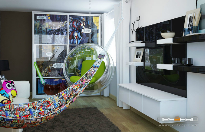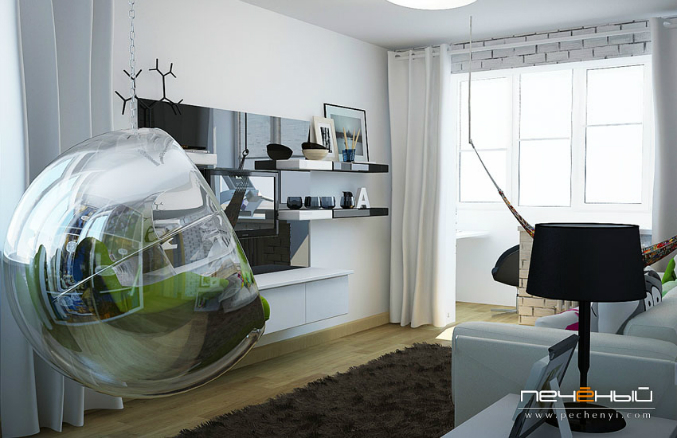 Кресло-шар был предложен в поддержку гамака - чтобы такой необычный элемент не выглядел "одиноко". Получилось, что какая-то часть мебели стоит на полу, а какая-то - подвешена в воздухе. :) От шкафа до кресла - около метра, то есть вполне достаточно для того, чтобы пройти к окну или необходимым полкам.