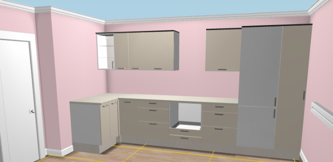 ИТОГО вверху не симметрично,( хотя если сделать шкафы 60 с двумя дверками-симметрично, но мелкие элементы) .удобно,функционально,НО маленькое расстояние между мойкой и плитой, из-за пенала громоздко, возможно вместо пенала оставим куллер с водой.............
