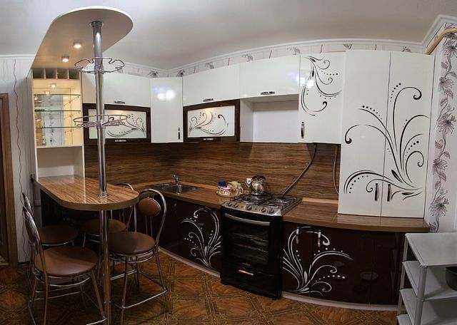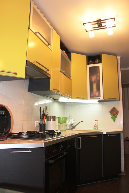 Фоток еще нет. У меня тоже кухня не большая, и у нас колонка. Колонку планирую убрать как бы под шкаф. А над плитой шкафчик или полочку, так как я планирую шкафы до потолка. Ну вот, что та типа такого.