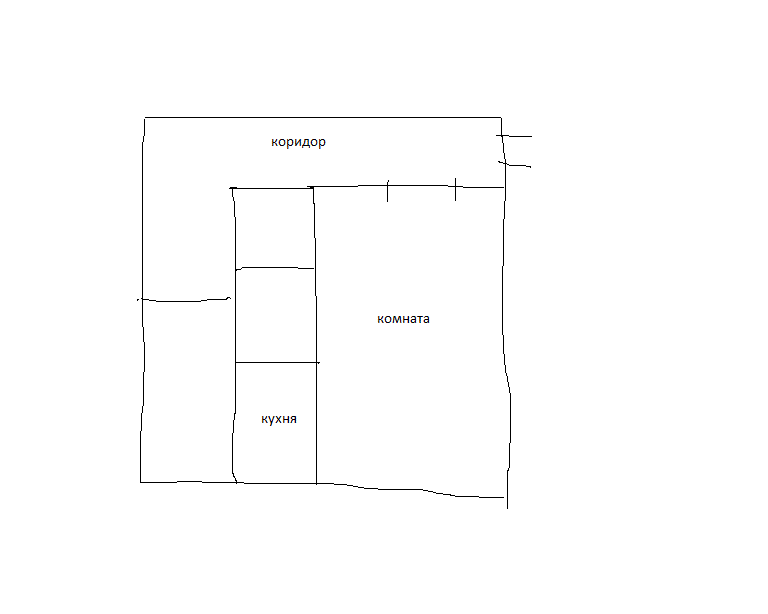 Имеем: большую комнату, вытянутую. Через дверь коридор.ю Одна стена этой комнаты совместная с кухней. Если не очень понятно объяснила, то вот рисуночек :)))